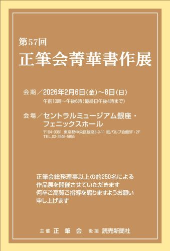 第57回正筆会菁華書作展を開催します 2026.01.06 2026年2月6日(金)~8日(日)セントラルミュージアム銀座・フェニックスホールにおいて、第57回正筆会菁華書作展を開催します。正筆会の総務理事以上の役員による作品展です。 巡回展 岡山展 とき 2026年4月10日(金)~12日(日) 会場 岡山県天神山文化プラザ 岡山市北区天神町8-54 ※巡回展は一部展示